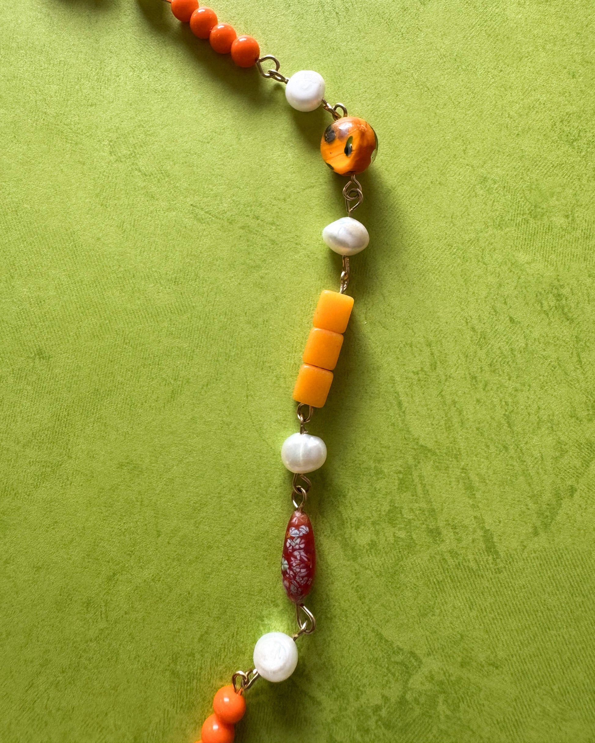 14 kt gold fill wire wrapped necklace adorned with vintage beads and fresh water pearls.