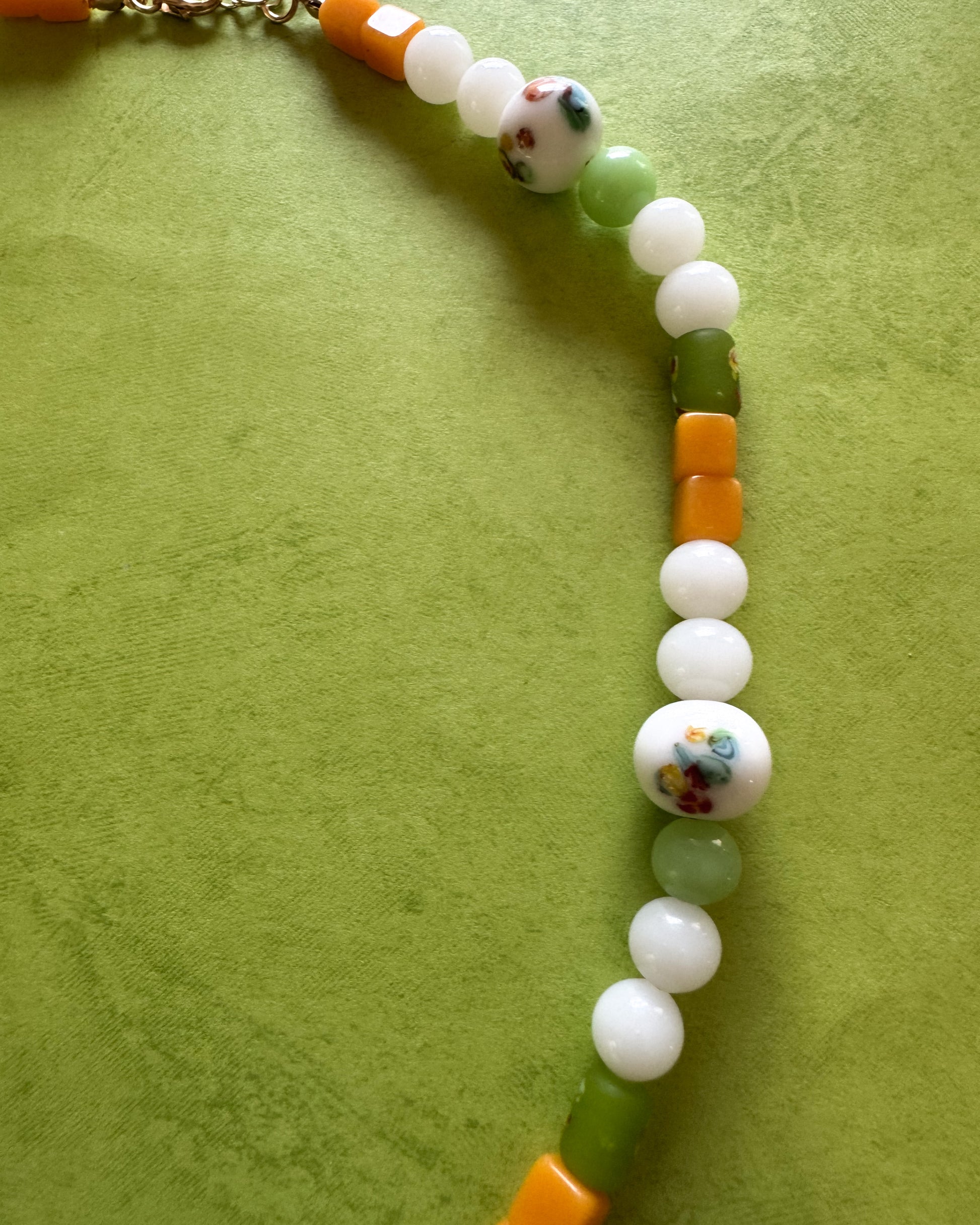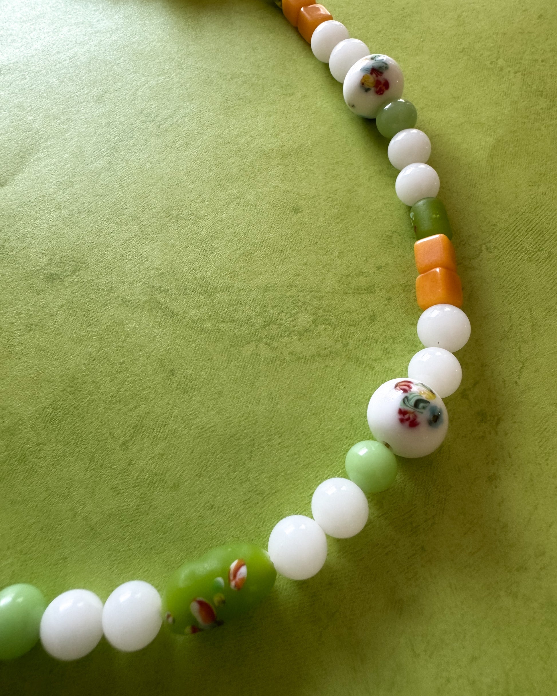 Beaded necklace adorned with vintage beads and fresh water pearls.