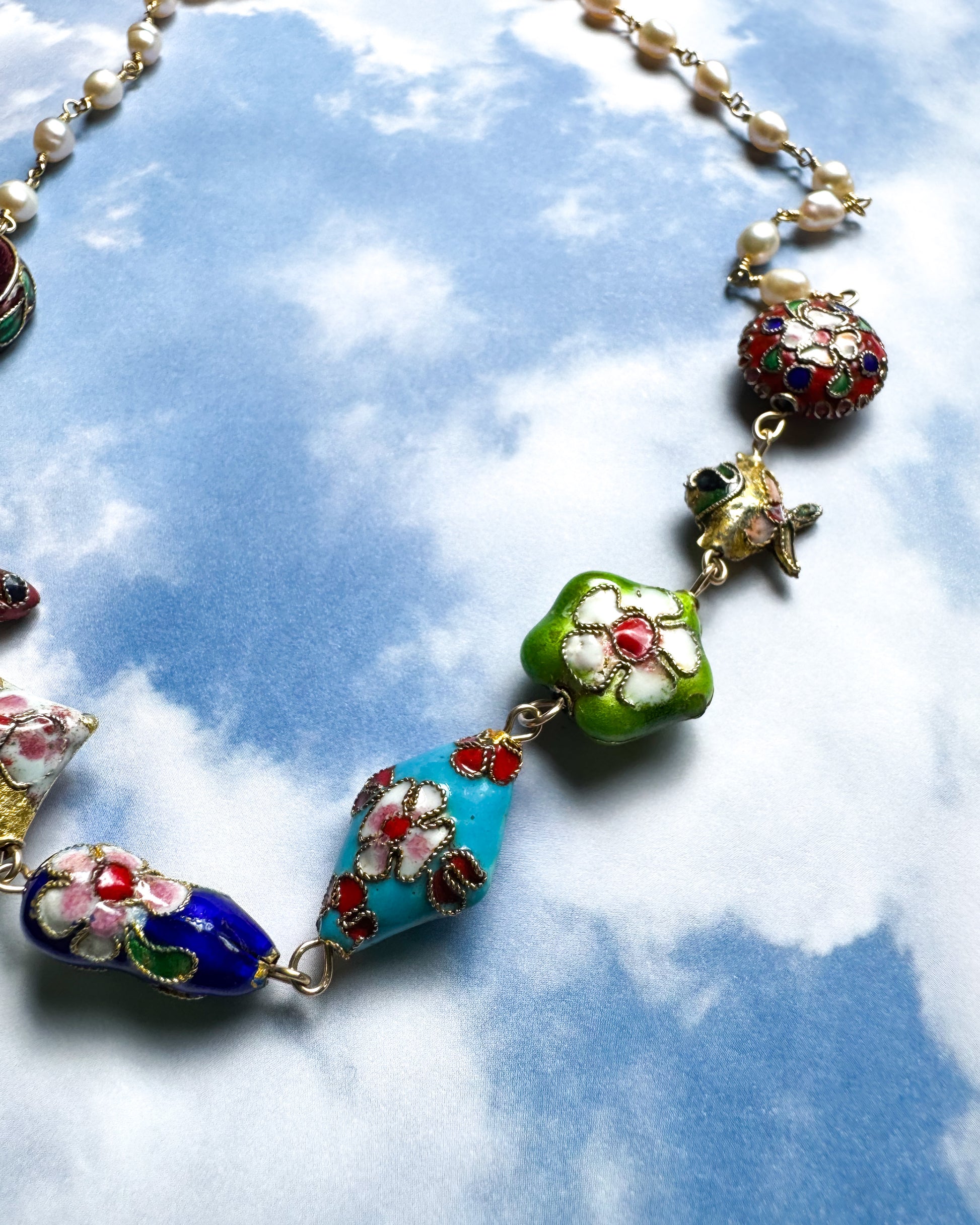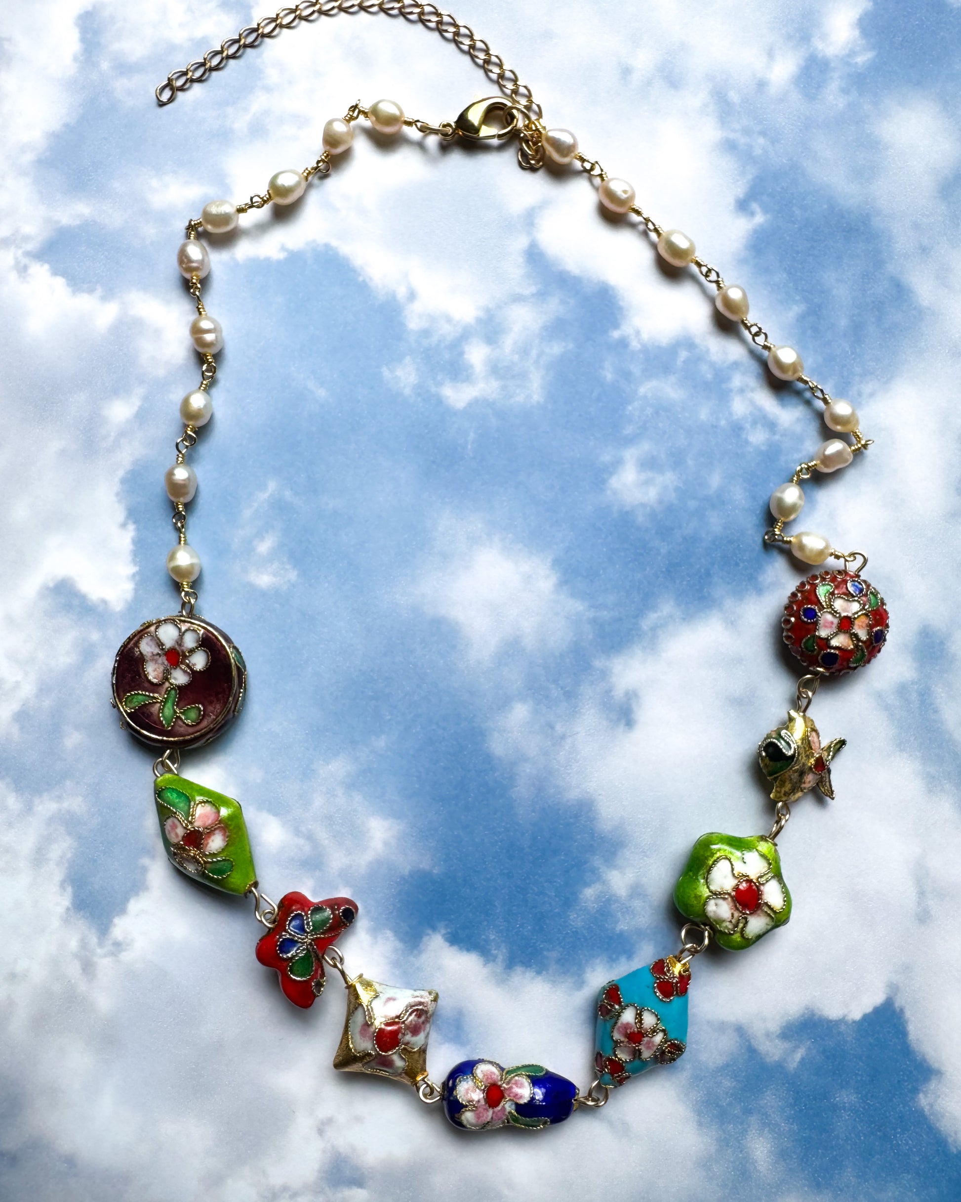 Freshwater pearl and cloisonne bead necklace.